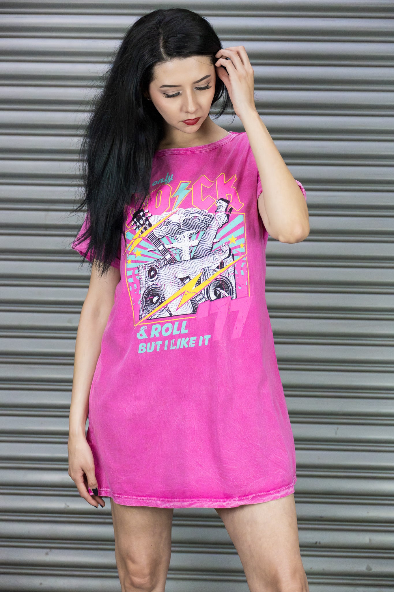 The loose fit and knee-length cut make it an effortless piece for everyday styling. Pair it with boots, sneakers, or layer it under a jacket for that off-duty rock look. Available in both magenta and black colorways, it’s bold, comfortable, and ready for wherever the night takes you.