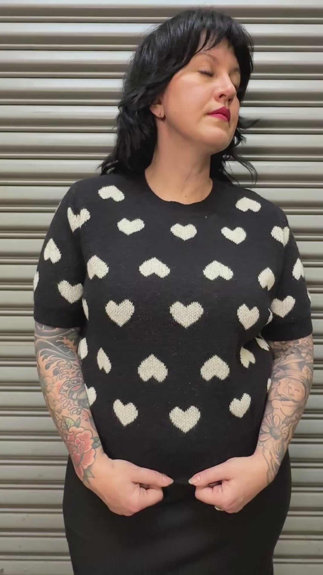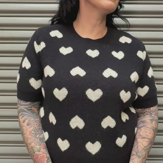 Soft on the surface, punk at heart. The Hardcore Softie Sweater is a waist-length knit featuring a bold heart pattern, short puff sleeves, and subtle cuffing for structure. Made from a soft, stretchy knit, it brings playful contrast to your wardrobe — romantic without being precious, graphic without feeling loud.